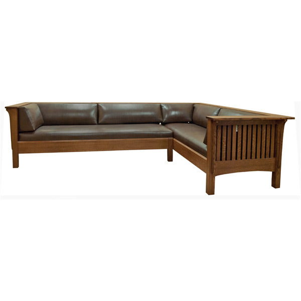 This exceptionally durable Mission Sectional features a sealed conversion varnish that protects this stylish piece from water, oil, alcohol and even nail polish. In addition, it features a wrap-around back wood panel that is exposed for easy arrangement in any room. This classic and timeless Amish Mission Sectional also features an incorporated webbing system that is both strong and flexible for great comfort and durability.