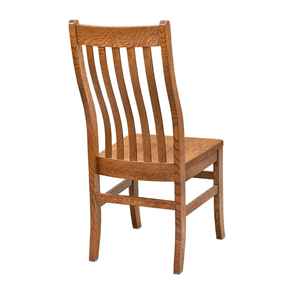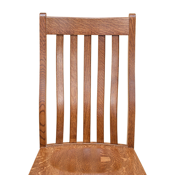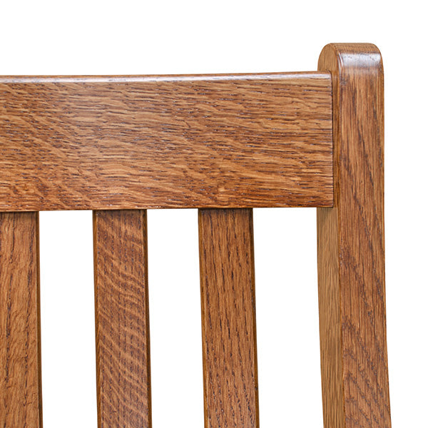 This American handmade Amish Mission Rochester Dining Chair comes in a variety of woods. Ergonomically designed, the curved back of this sturdy side chair is crafted to accommodate the natural curve of the spine, therefore providing excellent comfort. Built according to the traditional woodworking standards of the Arts & Crafts period, this oak side chair exemplifies the standards of heirloom quality furniture and is bound to last for generations.