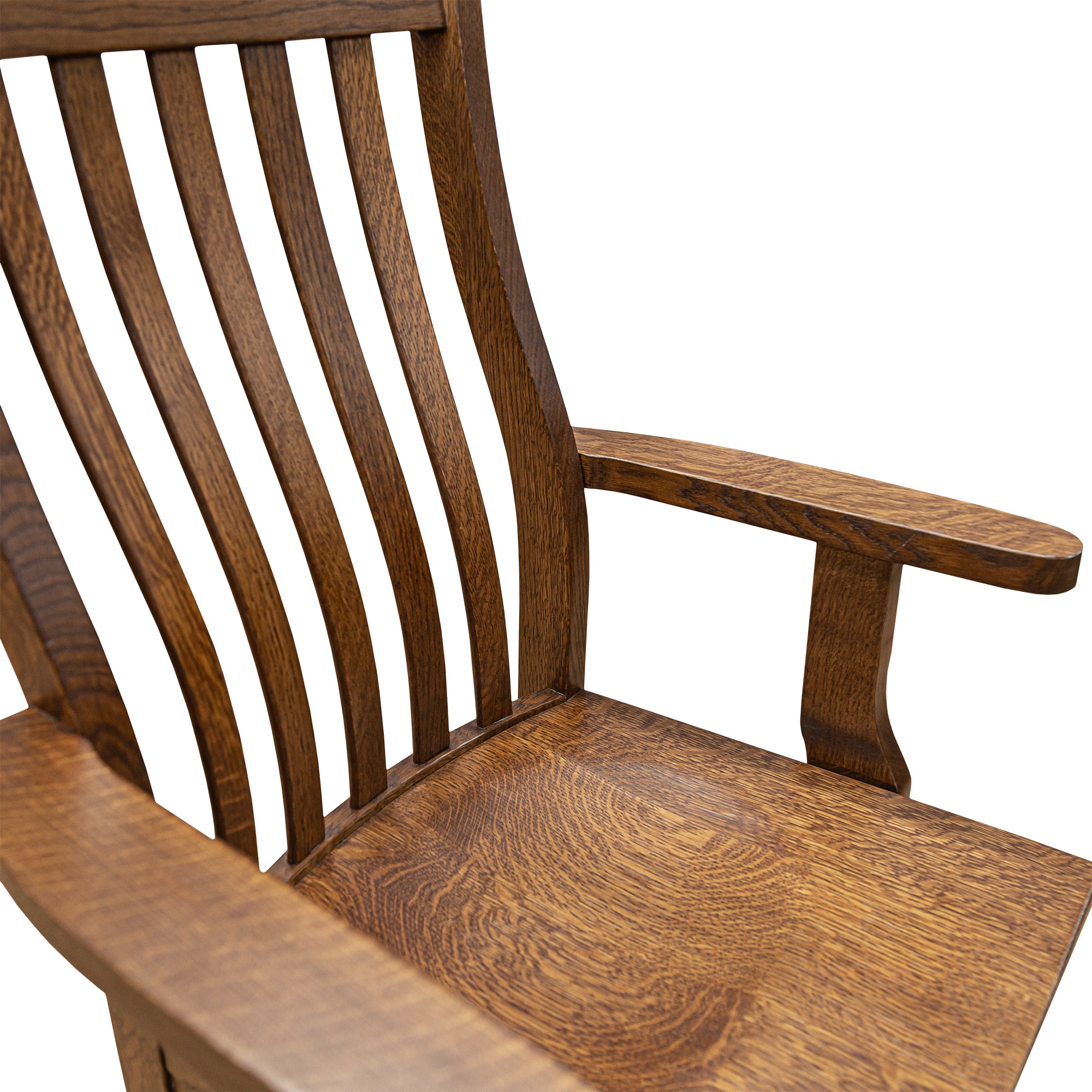 This American handmade Rochester Mission oak Arm Chair features solid wood construction and boasts a beautiful warm Mission finish. Ergonomically designed, the curved back of this sturdy chair is crafted to accommodate the natural curve of the spine, therefore providing excellent comfort. Built according to the traditional woodworking standards of the Arts & Crafts period, this oak arm chair exemplifies the standards of heirloom quality furniture and is bound to last for generations.