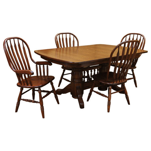 This Amish Traditional Double Base Dining Set-6 boasts an unparalleled level of craftsmanship in handmade furniture. The overall style of this particular furniture is reminiscent of the classic Arts and Crafts movement emphasizing elegance through simplicity. Constructed by skilled Amish craftsmen using hand selected Quarter Sawn White oak and finished in a warm mission cherry finish (shown).