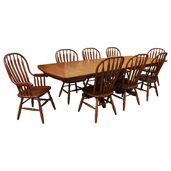 Furthermore, the matching Traditional Jumbo Bow Back Chairs are ergonomically designed; the curved back of these sturdy chairs are crafted to accommodate the natural curve of the spine, therefore providing excellent comfort. In addition, the finish in this dining set is sealed with conversion varnish that protects this elegant set from water, oil, alcohol and even nail polish. These features give this dining set not only a refined look but a prestigious feel as well.