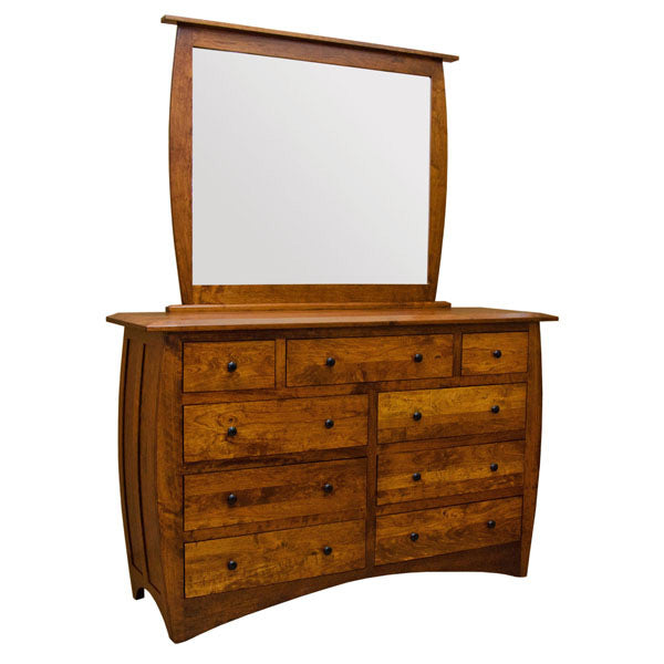 The unique Amish Traditional Hillsdale 9-Drawer Dresser is a beautiful piece for your master bedroom or guest room. This handsome, Amish-crafted dresser features nine drawers for ample storage, and a one-of-a-kind curved bottom detail, along with clean panel detailing on the sides of the piece. This hand crafted dresser has three smaller drawers at the top, ideal for smaller items, and three rows of double drawers with beautiful, dark knobs to complement any d?cor. This amazing, custom-made dresser also comes with an optional mirror, and is available in a variety of woods and finishes, including oak, maple, hickory, elm, and pine. This handmade dresser measures 43" high by 67" wide by 20" deep, and is part of a Hillsdale series of bedroom pieces, including night stands, beds and armoires. This Barn Furniture product is water and stain resistant, made in the USA, and like all of our products, we guarantee it will be a wonderful addition to your home.