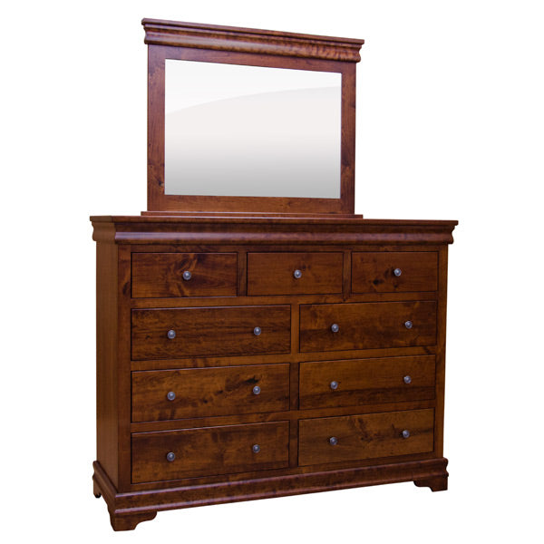 This Amish Traditional Lux 9-Drawer Dresser w/ Mirror displays a simple elegance and design that has stood the test of time. Constructed by skilled Amish craftsmen with solid Rustic Cherry Wood (shown), you can take pride in owning furniture built to the highest standards with the strictest attention to detail and unparalleled craftsmanship.