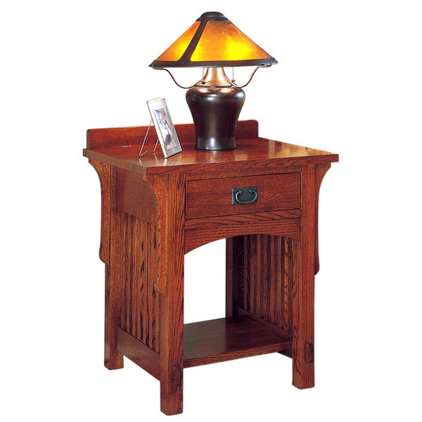 The Arts & Crafts 1 Drawer Night Stand features the traditional spindle sides to diffuse light and provide privacy of items stored on the bottom shelf. The leg features tenon caps as originally used on mortise and tenon joints during the period. The drawers are solid aromatic cedar with English dovetail joints on maple wood slides to provide the finest action.