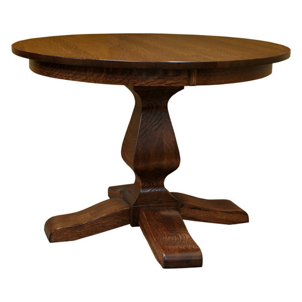 This 42? Round Ashley Table w/ One Leaf is constructed skillfully by highly experienced Amish Craftsmen in the Heartland of America. This table remains true to the Arts & Crafts style and would be perfect for those small and large gatherings with its (1) 12? leaf. The simplicity and quality of this table is unrivaled with its plain cut solid Quarter Sawn White Oak construction. Furthermore, this table is sealed with conversion varnish that protects it from water, oil, alcohol and even nail polish. This beautiful table features interesting legs and a stunning top enhanced by specks from the quarter sawn oak.