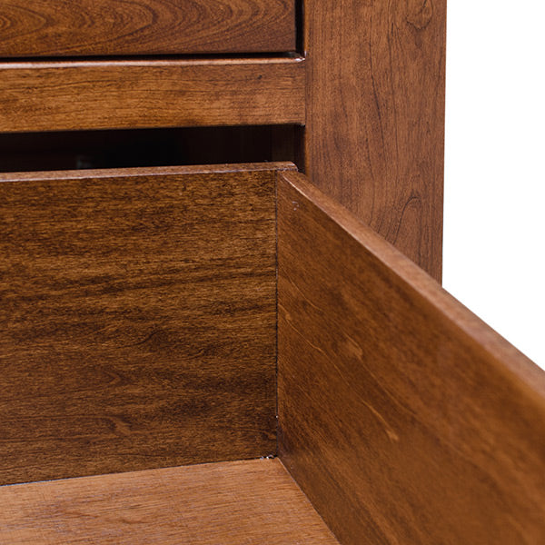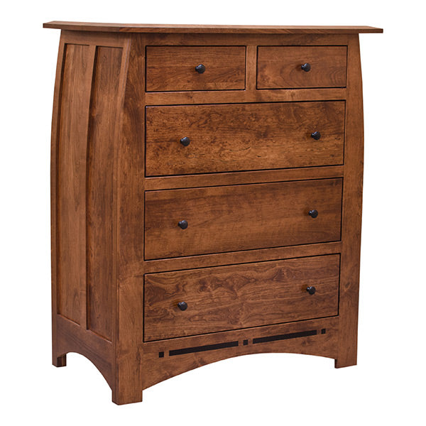 This Stylish Aspen Five Drawer Chest display aesthetic and the ingenuity of the skilled Amish craftsman. Appreciate the beauty of the Character Cherry wood that is perfectly complimented with the OCS 113 finish. This is also one of our main stains that are used in our furniture. This unit is handcrafted and not from an assembly line and great addition to your bedroom. This is also available in variety of woods and finishes. It is also available in Character Quartersawn WHite Oak wood which is the same price as the Rustic Cherry wood.