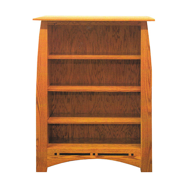 This Amish Hand Made Aspen Bookcase features (optional) Ebony Inlays at base and is shown 38" Wide x 50" High. Other Solid Hardwood Options Are Also Available. Customizable to any size and/or color.