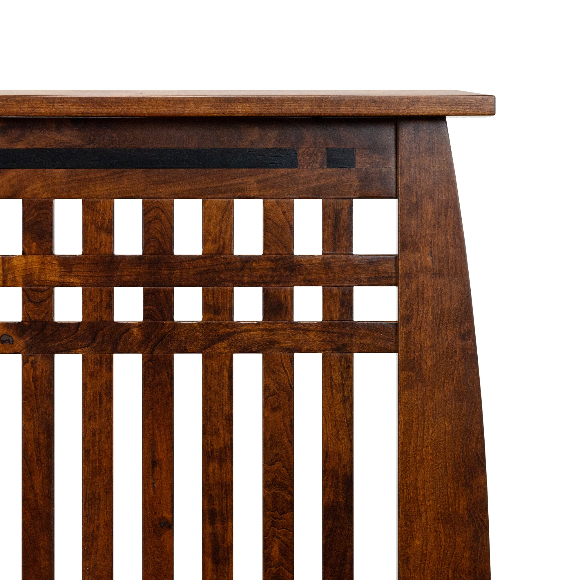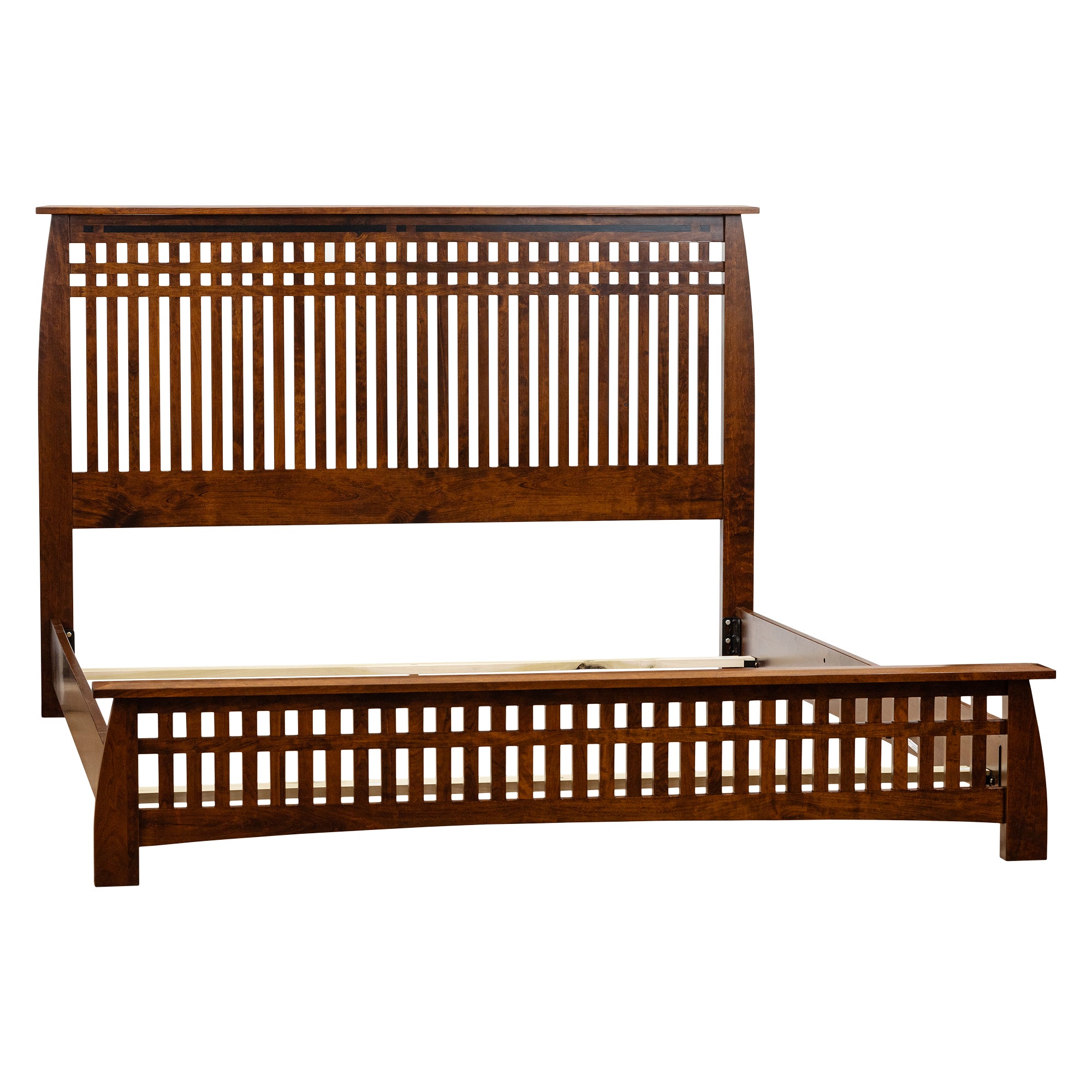 This custom commission is in our Aspen Style reminiscent of the designs of Frank Lloyd Wright and the flavor of a French Vineyard. This Bed is available in any size with or without Ebony inlays and in any finish. This bed will probably never be in stock exactly as shown; however, we would love to build one for you exactly the way you want it. The bed shown here is fabricated from Quarter Sawn White Oak and in a Natural finish.