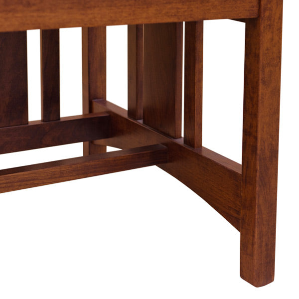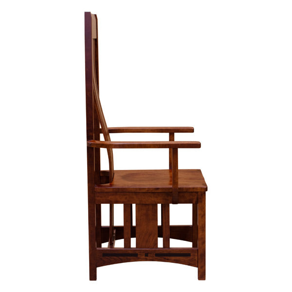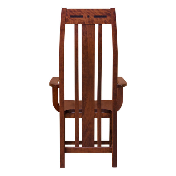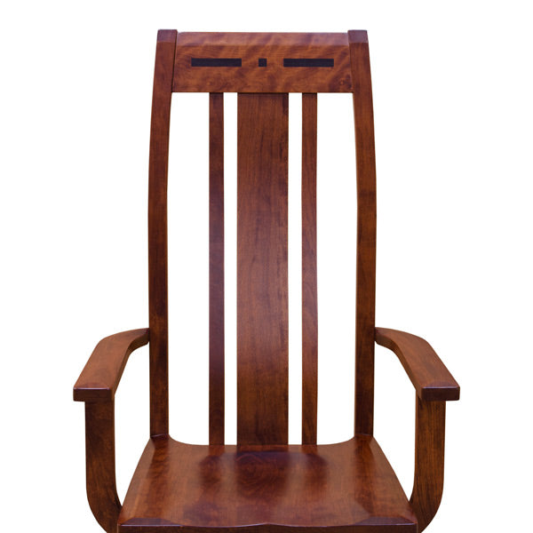 The Amish Collection features the Mission Style Aspen Cherry Arm chair. Constructed by skilled craftsmen in America?s heartland, this armchair features the details standard in Amish style. This chair features a beautiful warm finish and a curved back for ultimate comfort. With hand selected Cherry hard wood construction and beautiful ebony inlay, this armchair stands out at the ends of the matching Mission style Dining Table or independently.