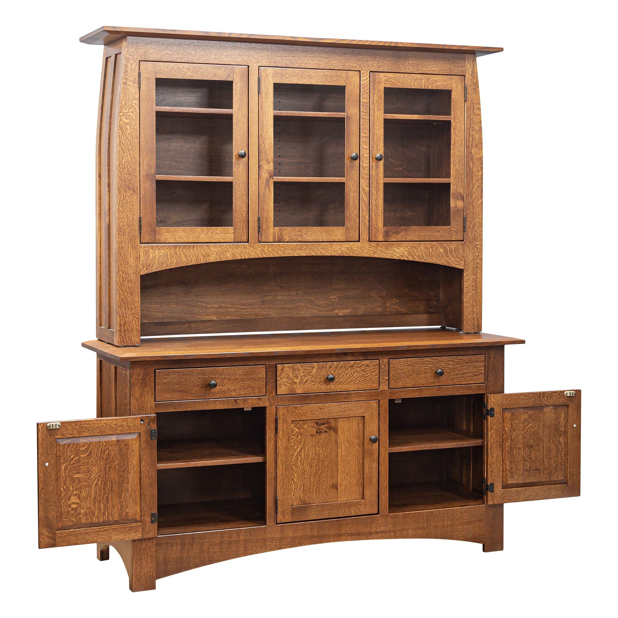 This Aspen China Cabinet is available to base only or as a set as pictured. The model shown is 65 inches wide and has an overall height of 81 inches. Base only is 34" high. Solid Quartersawn White Oak Cherry is the material we used in this but you are not limited in any way as to size color or wood species used. Drawers are dovetail jointed and on ball-bearing drawer sliders. Ample serving area with our ultra-durable bar top finish. We can reconfigure this item to suit your need if this particular model needs to be built to your specifications.