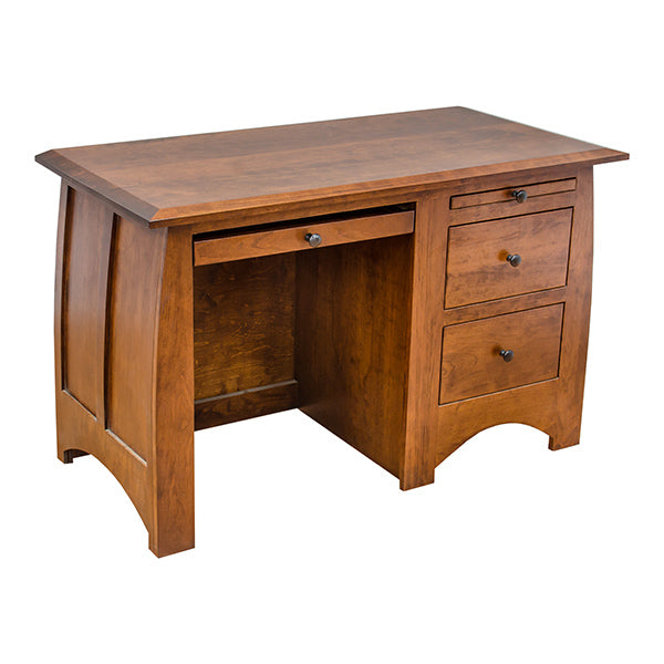This Amish Hand Made Aspen Writing Desk pictured here is 48" wide and also available in any Size and any special details requested. Priced here in Solid Character Cherry Wood, however All woods are available in your choice of Plain Cut Oak, Quarter Sawn White Oak, Walnut or Elm. Color choices are almost unlimited (see below). Call for Quotation for changes. This unique design harkens back to the mid 20th Century but will be at home in any Architectural era where wood and simple curves catch the eye. We can build any piece of furniture in this design.