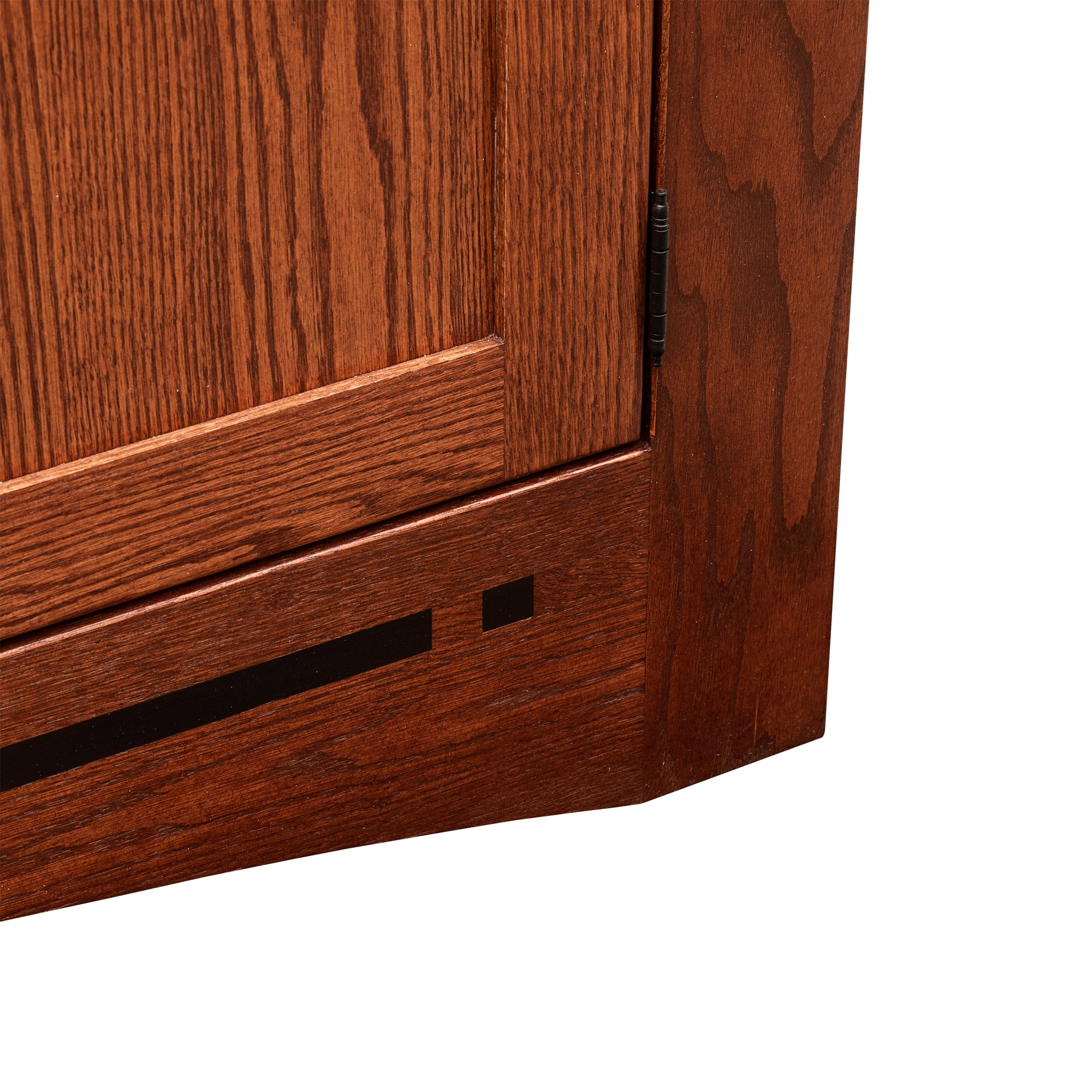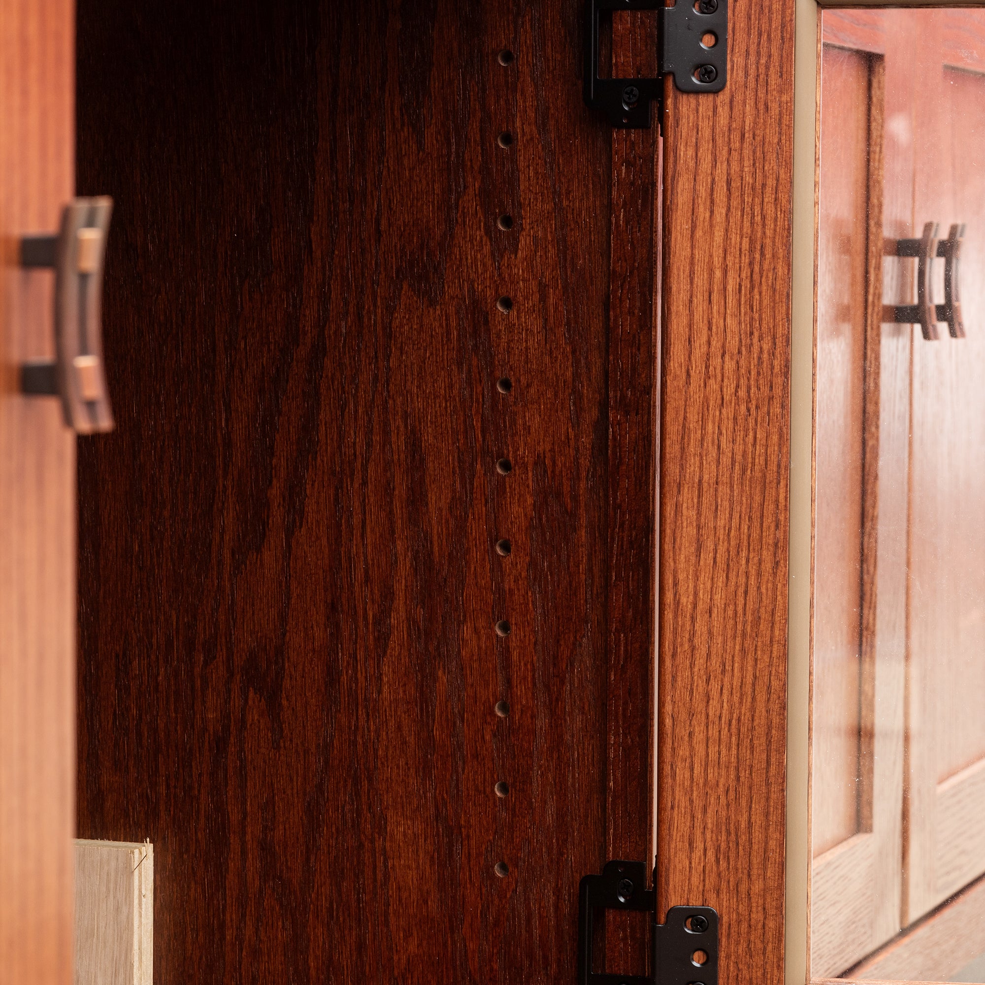 As shown, it has Inlays and all glass doors. Another option is to have only the middle door to be glass and the left and right door to be solid wood.