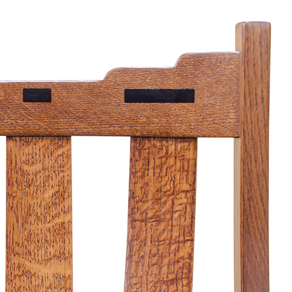 This custom Greene and Greene detailed chair was designed for Ken and Lisa from Historic La Crescenta, California. We placed Ebony inlays on both front and back of the cloud lift top rail and this chair is unusually comfortable because of the steam bent back struts. We would love to build a set for you or it may be in stock, because we are adding this item to our standard line. We can also build matching stools and arm chairs if you like. All woods are available including Cherry, Maple, Walnut and Elm. We offer virtually unlimited finish choices.