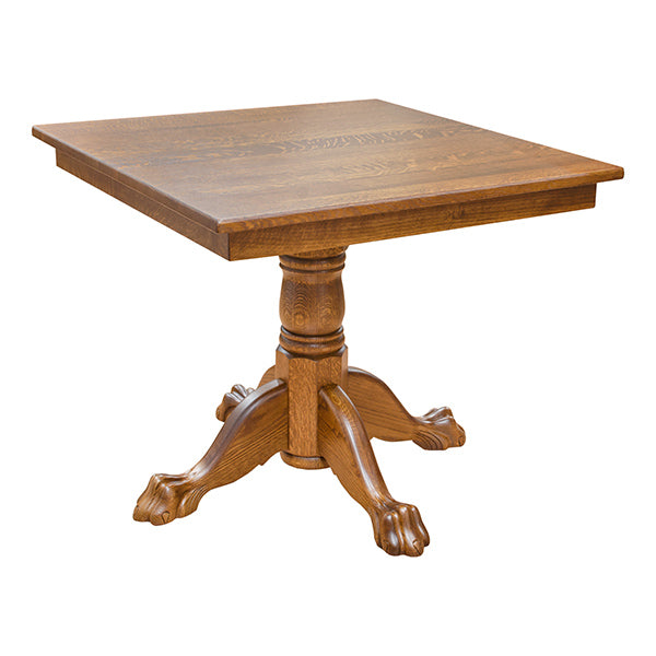This square Ball & Claw Dining Table is an excellent fit for a kitchen, sunroom, or eating nook, and is one of many custom-made, claw-footed tables from Barn Furniture Mart. Its compact, square top has a decorative, center pole, with ornate, claw feet for stability and a little flair. This handsome, Amish-crafted dining table measures 30" high by 36" wide by 36" deep, and will easily seat four for breakfast, lunch, or dinner! The handmade Bell & Claw Dining Table is available in a range of wood options and finishes that include plain cut oak, quartersawn white oak (pictured), cherry, character walnut, and heartwood walnut. Like all of our solid wood furniture from Barn Furniture Mart, this elegant table is crafted to be stain and water resistant, is made in the USA.