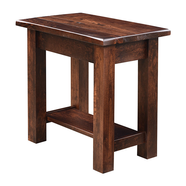 The rustic, Amish-made Barn Floor Chair Side Table is an ideal fit for a living room chair, with a manageable size of 16" wide by 24" deep by 24" high. This handmade chair side table has a “barn floor” look with a plank-style table top, and sturdy, squared-off legs connected by a plank at the bottom of the table. Shown in rustic cherry, this unique, custom-made table also is available in a variety of wood options, such as oak, cherry, and maple. This fitting chair side table makes a great match with the other living room pieces in the country-style, Barn Floor line, like the Barn Floor Coffee Table or the Barn Floor End Table. All solid wood furniture from Barn Furniture Mart is made in the USA, is designed to resist water damage and staining, and comes with a satisfaction guarantee.