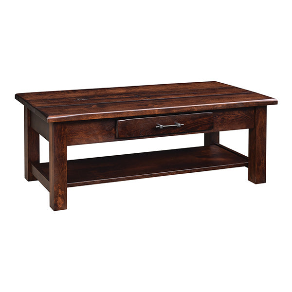 The handmade Barn Floor Coffee Table combines a “barn floor,” plank-style table top with the elegance of a classic coffee table. This handsome table has a single drawer with a rustic handle for storage, as well as a full shelf at the bottom of the table, great for storing books or magazines. Round out your living space with this coffee table’s sister product—the Barn Floor End Table and the Barn Floor Sofa Table—for a homey and elegant living room or den. Measuring 48" wide by 22" deep by 18" high, this Amish-crafted coffee table is available in an array of finish and wood choices, including cherry, oak, and maple (shown in rustic cherry). Like all of the solid wood furniture from Barn Furniture Mart, this lovely coffee table comes with a satisfaction guarantee, is made in the USA, and is crafted to be water and stain resistant.