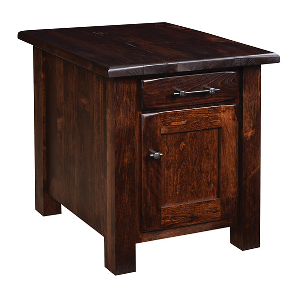 The homey, Barn Floor End Table adds a rustic touch to any den or living room, with its plank-style table top that gives a “barn floor” look, and details on the rest of the table that gives a slightly distressed feel. This handsome, American-made end table includes a drawer and cabinet with single door for easy storage, and is a great fit with the other living room pieces in the substantial Barn Floor line that includes the Barn Floor Coffee Table and the Barn Floor Chair Side Table. Measuring 22" wide by 24" deep by 24" high, this custom-made table is available in an array of finishes and wood options, including cherry, maple, and oak (show in rustic cherry). Our solid wood furniture is made in the USA, is designed to be water and stain resistant, and comes with a satisfaction guarantee.
