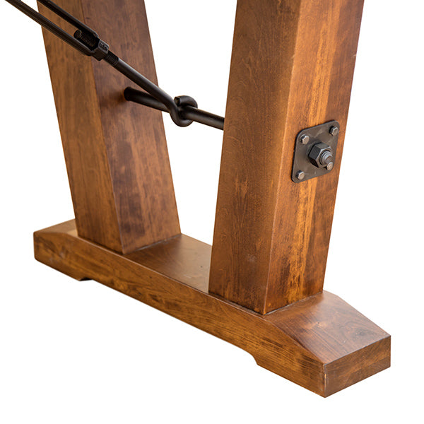 This Bay Rustic Solid Cherry Wood table is 100% Solid without any Veneer whatsoever. Extremely robustly constructed Trestle Base with Iron bracing and turnbuckles are unmatched. Check out the thick Breadboarded top details and self storing leaf feature.Hand crafted in the United States and in stock for the holidays. We stock numerous chairs and matching benches too. Alternate woods and colors are always available from Natural to Onyx finishes. All tables include our advanced high durability finish.