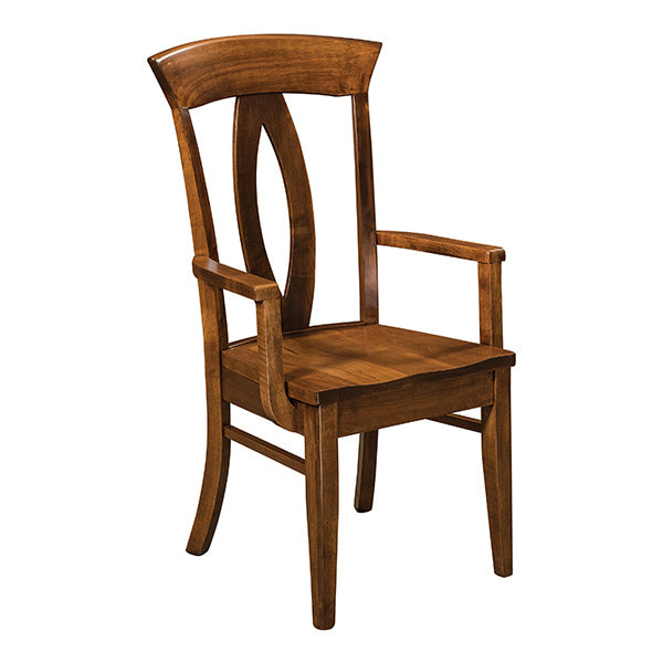 This Brookfield Arm Chair is part of our American Made Amish built Seating series. We offer North American Hardwood choices of Oak, Cherry, Maple, Walnut or Elm. Choose your finish from natural to Onyx with over 150 tones. The choice is yours on all our chairs for both wood seats or upholstered. These chairs are bench made. Additionally, fine fabrics and vinyl?s or Top Grain Leathers are available. We do not use ?Bi-Cast or Recast? Leather because they do not wear well. All variations are available. Bar Stools and arm Chairs are always available. This huge variety is available because we make the product, not import parts to assemble and call it American Made!