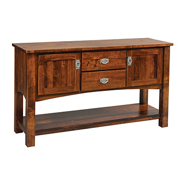 Our Brunswick Server Buffet can be expanded to any size, wood or finish. You can also get matching tops for a spectacular China Cabinet. We craft our Amish Hand Made furniture with care and respect for the Craftsman Art. Wood Choices are Solid Maple, Character Cherry, Quarter Sawn White Oak, Gray Elm, Black Walnut and Plain Cut Oak. Pictured here is Brown Maple and is stained in OCS113 on Brown Maple then finished with our exclusive Urethane Conversion Varnish for ultimate durability.