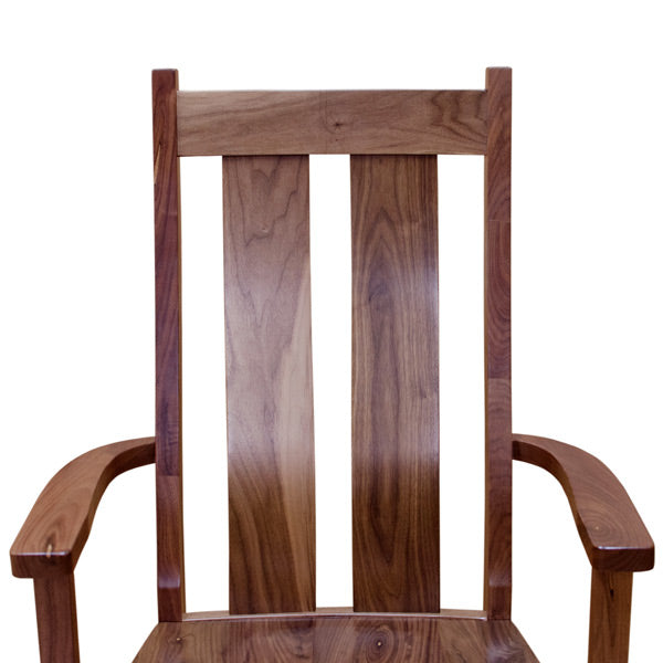 This Amish Mission Bungalow Arm Chair is constructed out of solid beautiful Character Walnut (shown) and is skillfully handmade by highly experienced Amish Craftsmen in the Heartland of America. Inspired by the Arts & Crafts movement at the turn of the last century, this beautiful mission style chair features a curved back that accommodates the natural curve of the spine providing excellent comfort.