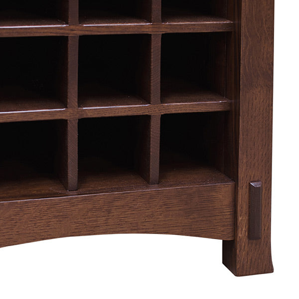This simple crafted Wine Rack is built in the United States. Even the Quartersawn White Oak wood that is used in this beautiful unit is harvest and Kiln dry here in the US. This is a perfect item for someone that has a craftsman style d?cor. As shown, it is finish in the OCS 226 Coffee. Now you can store your favorite wine with ease and style that compliments your surrounding Arts & Crafts furniture.