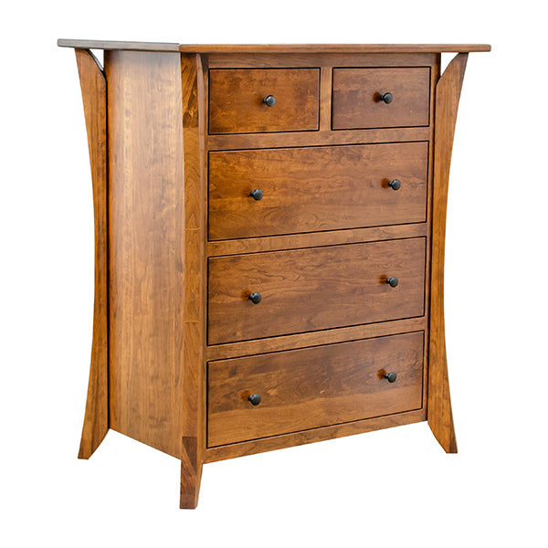 Amish Crafted Solid Wood FurnitureOur Amish Hand Made Caledonia Design Chest of Drawers pictured is also available in any Size and any special details requested. Priced here in Solid Maple. All woods are available in your choice of Plain Cut Oak, Quarter White Oak, Walnut, Cherry or Elm. Color choices are almost unlimited (see below). Call fro Quotation for changes. This unique design harkens back to the mid 20th Century but will be at home in any Architectural era where wood and simple curves catch the eye. We can build any piece of furniture in this design.