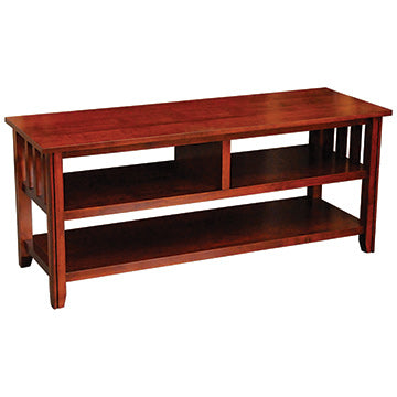 The Century Mission Plasma TV Stand offers the practicality of a TV stand with the style of a classic, mission piece of solid wood furniture. This American-made television stand features extra shelving in the unit, ideal for storing media, a cable box or blue-ray player or display items. With beautiful, traditional mission-style slats on the sides of the unit, this mission furniture measures 52" wide by 18" deep by 22" high, ideal for use in a family room, den, or office. This handsome, Amish-crafted Century Mission Plasma TV stand is part of an entire line of mission-style furniture that includes a coffee table, end table and console, and comes in oak, maple, cherry woods with several finishes to meet your design needs. Like all of the solid wood furniture from Barn Furniture, this stand is made in the USA, is stain and water resistant, and has a satisfaction guarantee.