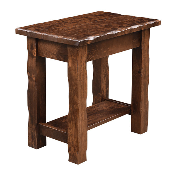 This compact side table is part of an entire series of hand-hewn living room furniture pieces from Barn Furniture Mart, including a sofa table, end tables, and coffee tables. The rustic side chair features distressed details and a handmade appearance, and offers stability with a small plane that connects at the bottom of the table legs. This Amish-chair side table measures 16" high by 24" wide by 24" deep, and comes in a variety of woods and finishes to suit your needs, which includes oak, maple, and cherry. This unique, custom-made side table is an ideal addition to your den, living room, or office, and will complement any modern farmhouse or country d?cor. Like all of our solid wood furniture, this charming end table is made in the USA, is water and stain resistant, and is guaranteed to add value and style to your living space!