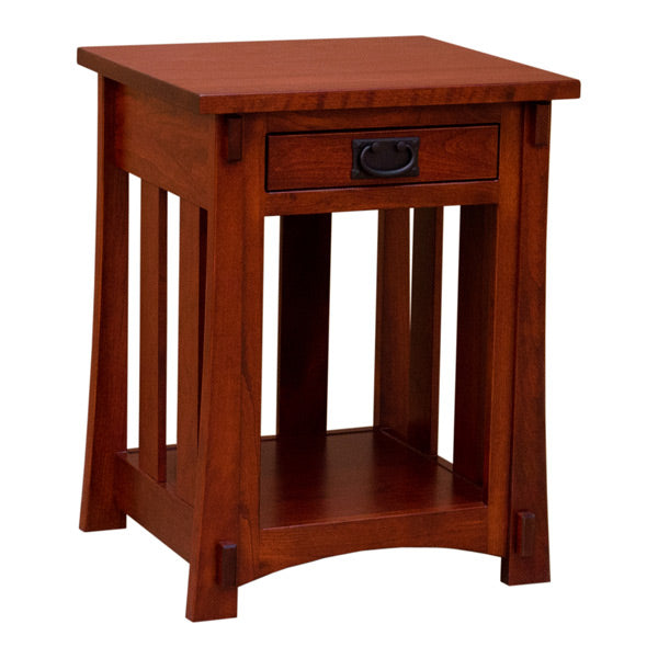 This Amish Mission One Drawer Night Stand w/ open slats side gives this a spacious feel. This beautiful unit compliments any surrounding home d?cor. It is constructed by solid Cherry wood and traditional English dovetail joints bonding the drawer. The drawer sits on full-extension under-mount soft-close drawer guides that easily glide open and shut without any exertion necessary. The drawer guides are also ?easy-release and easy-set,? which allows it to come out of the unit with ease.