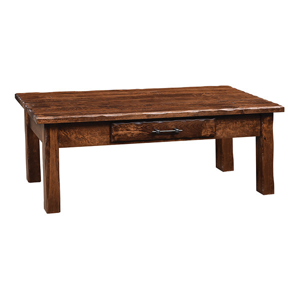 The handsome Coffee Table without Shelf is part of a fantastic series of rustic living room pieces, each with hand-hewn details that will fit any modern farmhouse or country d?cor. This Amish-made coffee table features a single drawer with a metal pull, great for quick storage, and strong table legs and construction that shows off chisel marks and distressing. Measuring 18" high by 48" wide by 22" deep, this elegant coffee table is a great companion piece to the others in the series, which include coffee tables, end tables, and a sofa table. The Coffee Table without Shelf is available in an array of woods and finishes that include red oak, rustic cherry (shown), quartersawn white oak, and more. Like all of the solid wood furniture from Barn Furniture, this custom-made table is made in the USA, and is crafted to be stain and water resistant.