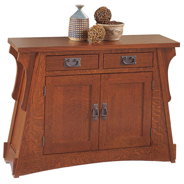 This heirloom quality Crofter Mission Console Table is made of Quartersawn Oak and features two Solid Cedar drawers with English Dovetail Joints. The lower panel doors(2) hide a large compartment with an adjustable shelf to customize your storage needs. The teardrop corbels provide elegant yet functional support. Shown in a Mission Cherry Finish.