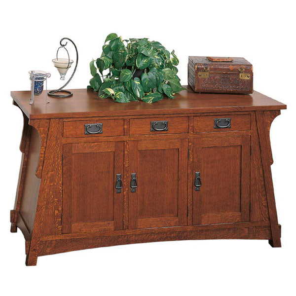 This heirloom quality Crofter Mission Sofa Table is made of Quartersawn Oak and features three cedar plywood bottom drawers with English Dovetail Joints. The lower panel doors(3) hide a large compartment with an adjustable shelf to customize your storage needs. The teardrop corbels provide elegant yet functional support. Shown in a Mission Cherry Finish.