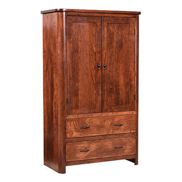This Armoire is part of our Mid Century Bedroom Collection and is Classic 1950's design. Drawers are English Dovetailed front and back and we use solid hardwood drawer boxes. Drawer suspension is Side Mount Full Extension ball bearing slides. Custom sizes and details are always avail options . We have it shown here in an OCS113 Michele's finished Solid American cherry. We have hundreds of finishes and many wood species to choose from. Call Toll Free: 888-302-2276