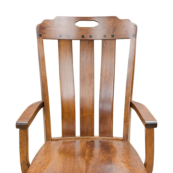 Our Curlew Greene and Greene Cherry Wood Chair is shown here in our OCS113 finish and comes in Arm chair, Side Chair, Bar Stools and Rocking chair configuration. Using the classic Charles and Henry Greene Cloud Lift Details and Ebony inlay Back Details you can be assured Quality Amish Hand Made Chairs fully integrated into a complete line of matching and coordinated items for every room in the Greene and Greene or Craftsman Style.