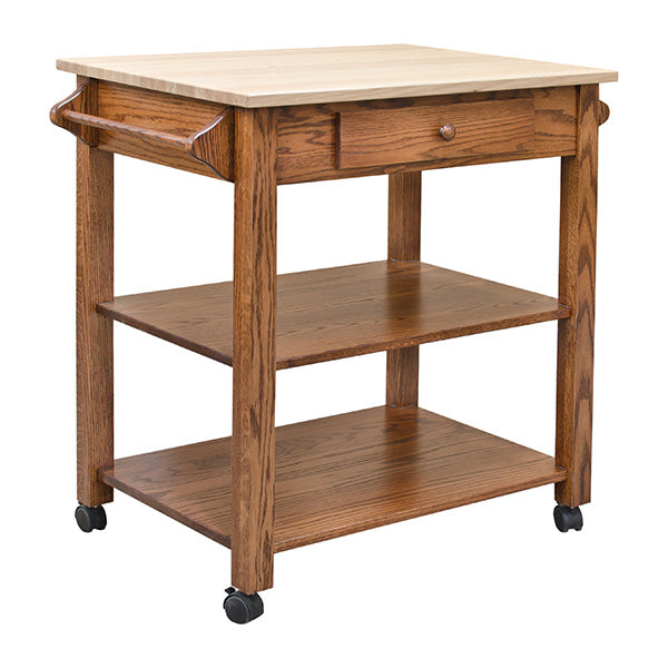 We offer this US made Kitchen island with custom finishes and sizes as well as the one as you see it. A natural Oak butcher block top and locking casters and a drawer are standard as you see it but you are not limited in any way. Any wood, color or size and configuration are available.