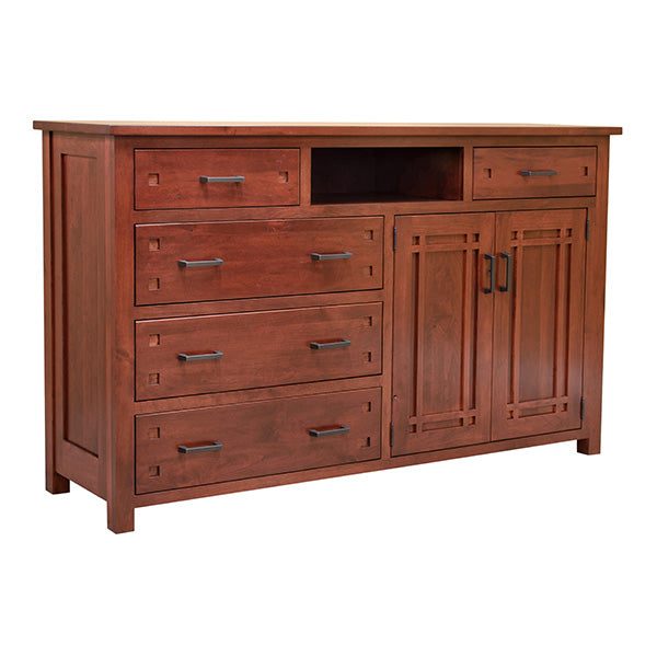 This custom designed Mule Chest was made for Sylvia of beautiful Cambria California from Solid Character Black Cherry utilizing traditional woodworking techniques. The use of classic bungalow Mullions and square negative space details add to the classic lines. You may order in any of our wood choices including Red Oak, Quarter Sawn White Oak, Cherry, Walnut, Elm, Maple or Mahogany.