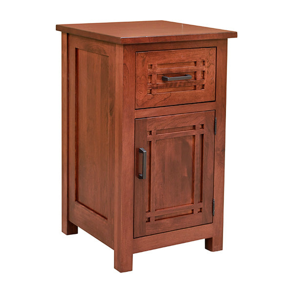 This custom built Bungalow night stand was built of solid Character Cherry Wood for Sylvia from beautiful Cambria California with traditional mullion detailing on drawers and headboard. Drawer is dovetail jointed and fully finished inside and out. Drawer and door is flush mount and size shown is for the size challenged living spaces. You may order in any of our wood choices including Red Oak, Quarter Sawn White Oak, Cherry, Walnut, Elm, Maple or Mahogany. Additionally, color choices are almost unlimited from Natural to Ebony and Black.