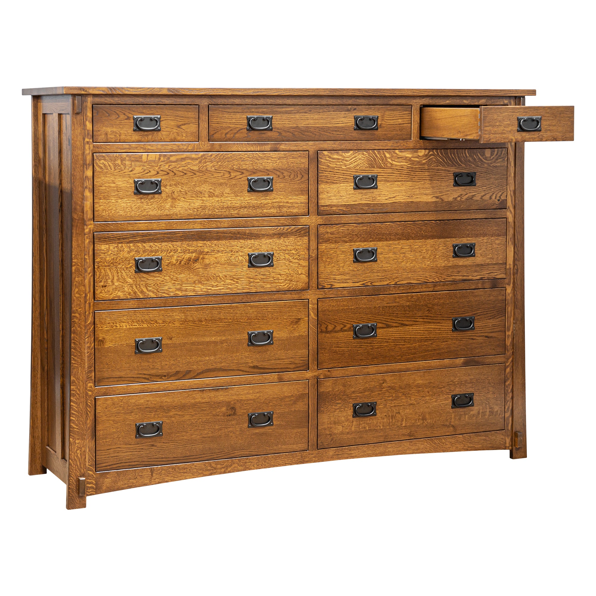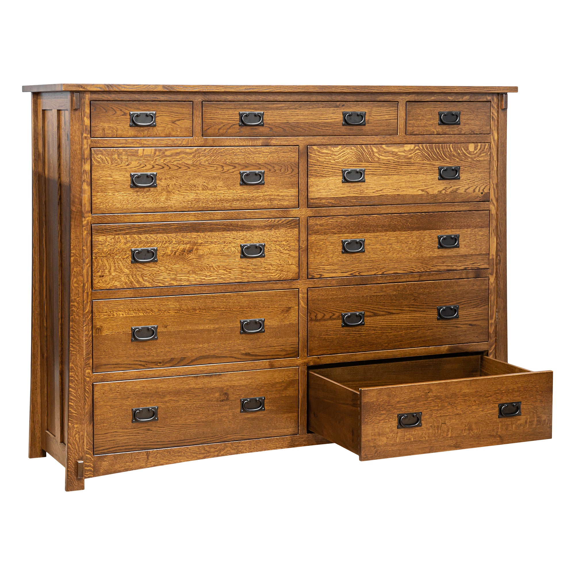 This Dutch 11-Drawer Mule Dresser is constructed from Solid Quarter Sawn White Oak and finished in a warm Mission Cherry (shown); this unit features solid oak drawers made with traditional English dovetail joints. In addition, the drawers sit on full-extension under-mount soft-close drawer guides that easily glide open and shut with no exertion necessary.