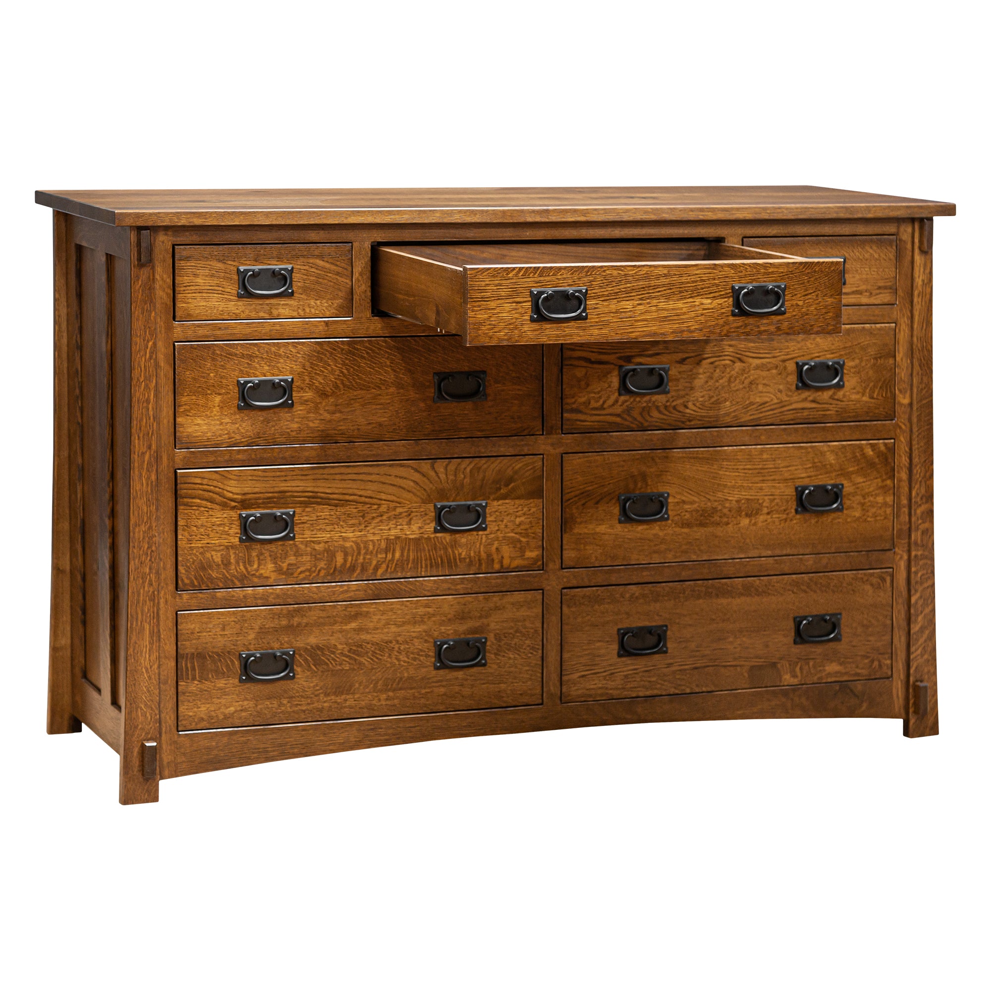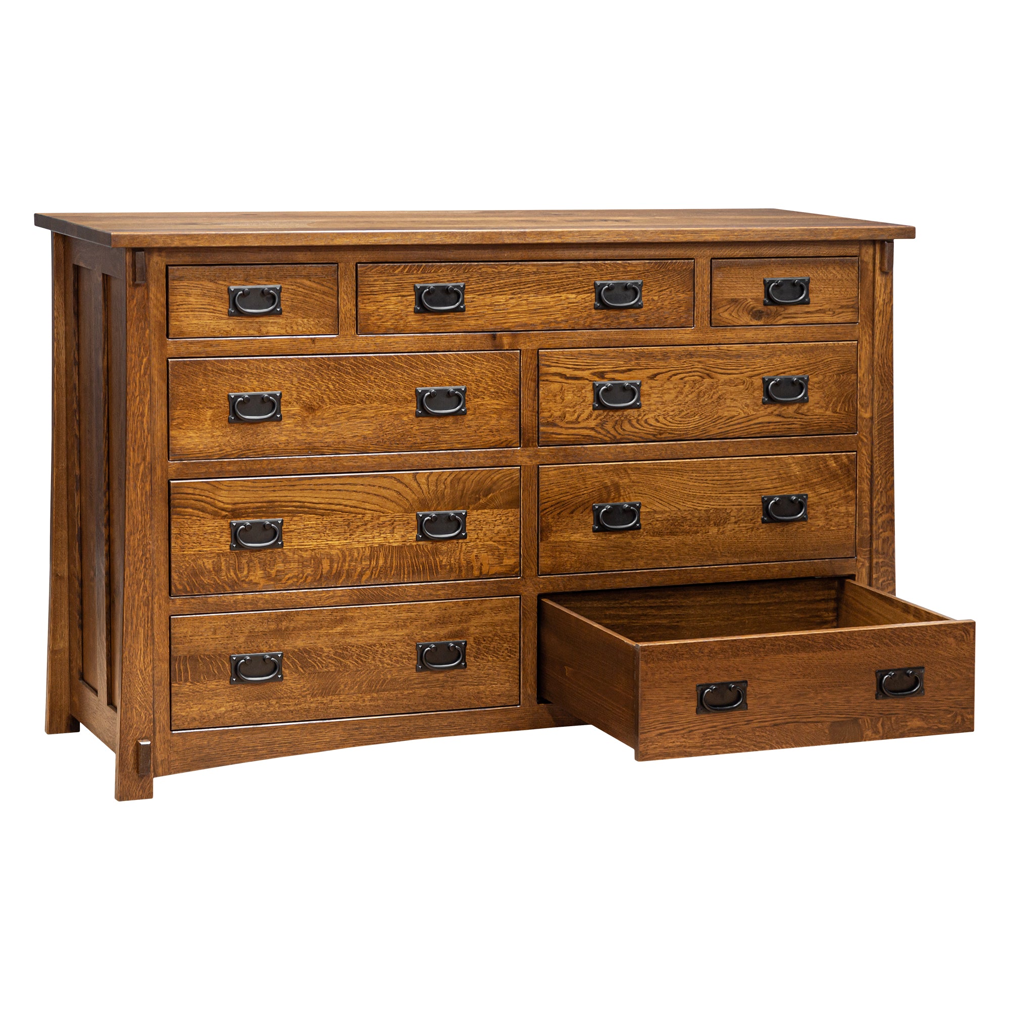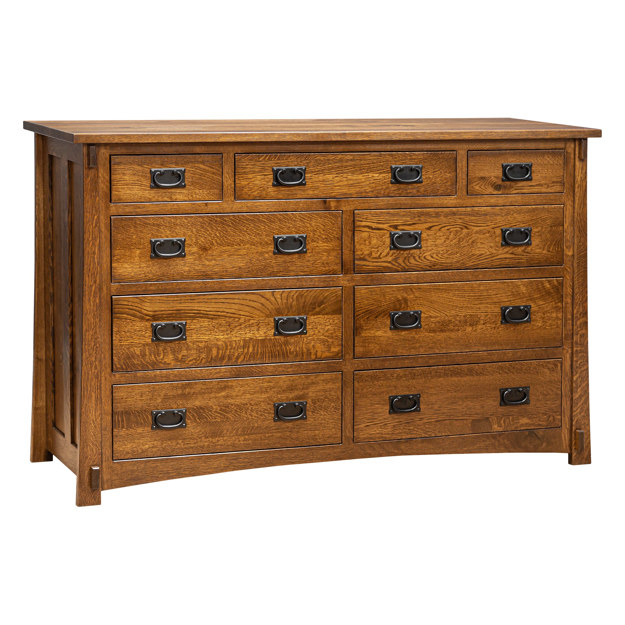 Furthermore, this elegant piece is sealed with conversion varnish; a finish that protects it from water, oil, and even nail polish. These features give this Dresser a sophisticated and prestigious feel. Available to be custom made in a selection of woods and finishes. This classic and timeless Amish Mission 7-Drawer Dresser offers great storage space and functionality in addition to being a lovely piece for your Bedroom.