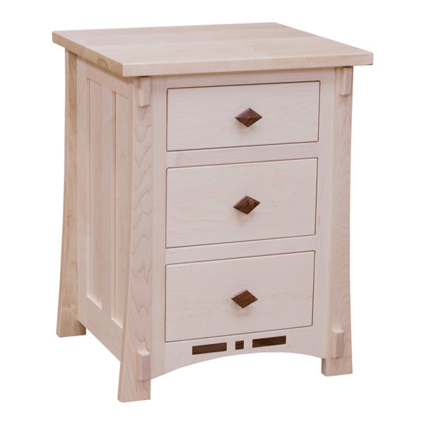The Dutch Maple Night Stand w/ 3 Drawers features a unique contemporary design with a flavor of Frank Lloyd Wright and the Arts & Crafts Movement. The entire Dutch group is handcrafted in the Heartland of American from solid Hard Rock Maple. The maple is hand selected for its even white color tones and striking grain patterns.