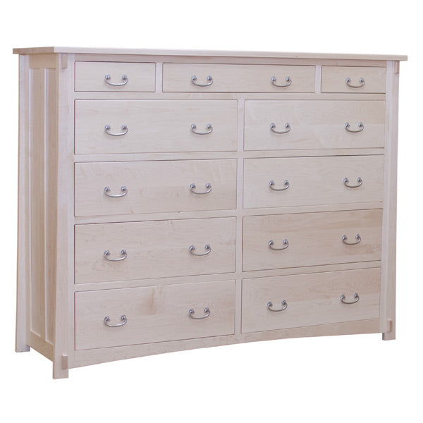 The Maple Mule Chest Dresser w/ 11 Drawers features a unique contemporary design with a flavor of Frank Lloyd Wright and the Arts & Crafts Movement. The beautiful large dresser is handcrafted in the Heartland of America from solid Hard Rock Maple. The maple is hand selected for its even white color tones and striking grain patterns.