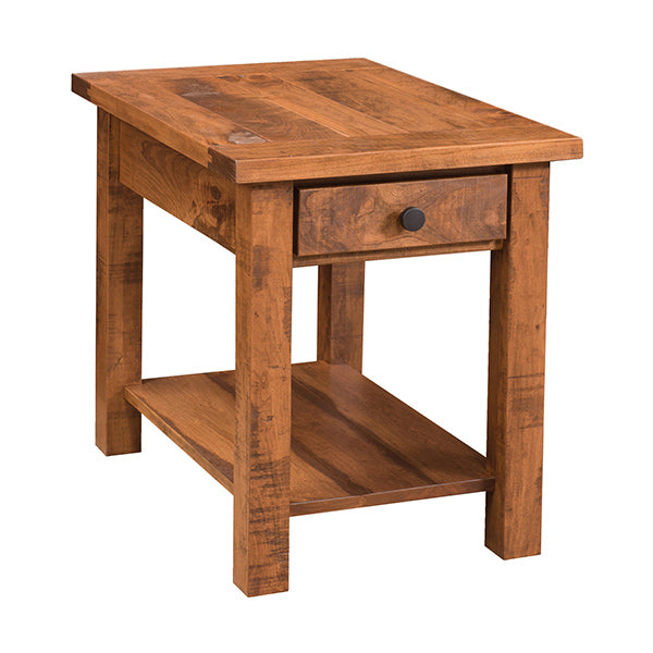 Our Farmhouse Living Room Set is shown here Amish Hand Crafted in Solid Plane Character Cherry with a thicker top and pegged Breadboard Ends and is available in any of our fine North American Hardwoods including Quarter Sawn White Oak Plane cut Oak and Maple remember, this series unparalleled quality. All sizes are available including but not limited to the end tables, coffee tables and sofa tables listed here. We will build in any size, wood or finish at similarly great prices even if custom.