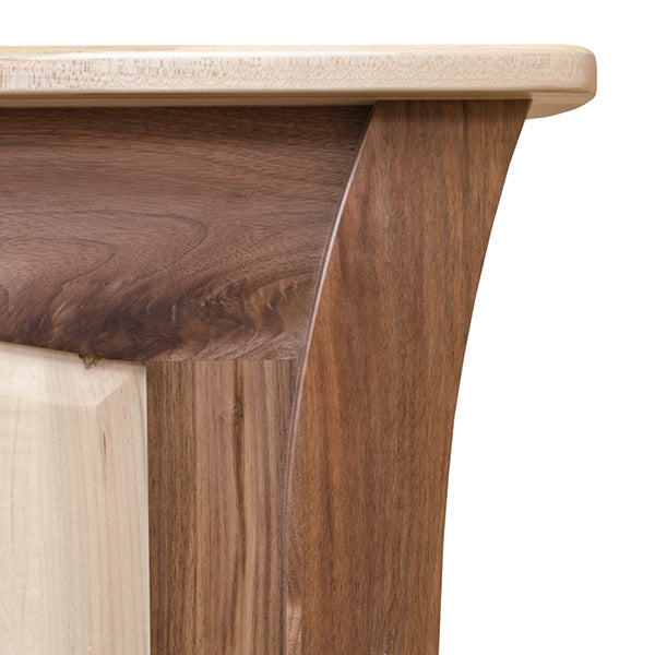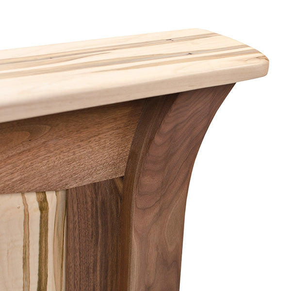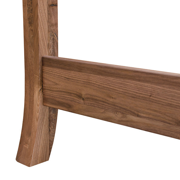 This gorgeous and unique Galveston Bed has a gentle curving legs and side details. The Natural Walnut with contrasting Wormy Maple is striking in it uniqueness. It can be customized as needed and custom pieces in any category including Dining room and entertainment centers are available. Below is the link for the beautiful Galveston dining set.