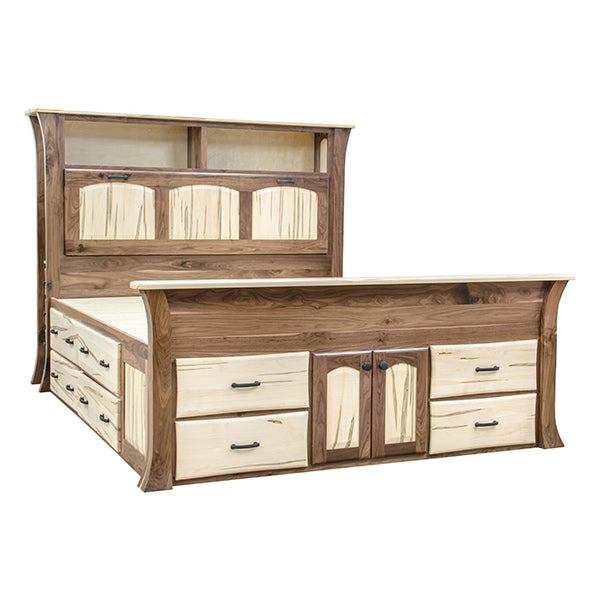 Our Galveston Chest bed is Amish Hand built to perfection. This Bookcase Platform King Bed is available in all sizes and disassembles for easy delivery. We feature heirloom quality typical of Amish constructed furniture. It is constructed by highly experienced Amish Craftsmen out of Solid Character Walnut and Spalted Maple. We carefully finish in a Natural Clear Bar top Conversion Varnish with satin Urethane. Let's analyze the attributes of this elegantly made King Bed. It features 16 Drawers and multiple door covered spaces. Solid wood drawers made with traditional English dovetail joints and full extension ball bearing runners. All woods and finishes are available as well as special sizes!