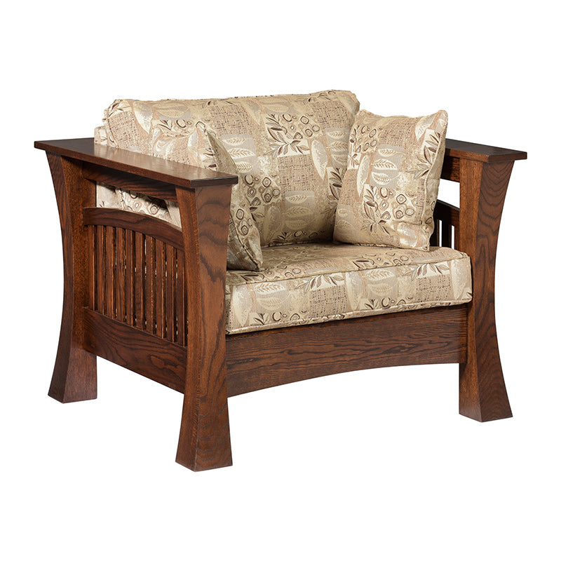 The custom-made Gateway Chair is a comfortable, relaxing addition to the Gateway collection from Barn Furniture, which includes chairs, tables and additional seating. This Amish-made chair has the same curved lines and slatted styling as the matching Gateway Love Seat, as well as the convenient and comfy Gateway Ottoman, and is a wonderful addition to den, living or family room! This oversized chair measures 41 1/4" wide by 39" deep by 35" high, and is available in a variety of wood finishes and fabric options—a versatile piece to match any décor. This handmade chair is designed to be water and stain resistant, is made in the USA, and like all Barn Furniture products, is guaranteed to add style and value to your home.