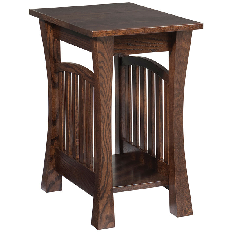 The Gateway Chairside End Table is a sleek, unique piece designed to complement the Gateway Chair, and is part of an entire line of products from Barn Furniture that feature a clean style and slatted side panel design. This handmade end table has a slim design, perfect for tight or smaller spaces, and measures 16" wide by 24" deep by 26 1/2" high. This Amish-crafted table is available in a variety of woods, including oak, maple and cherry, and will fit in with any décor. An ideal fit for a living room, den, or family room, this American-made end table is an ideal fit with our Gateway Love Seat, Gateway Chair or Gateway tables. Our custom-made furniture is finished to be stain and water resistant, is made in the USA, and Barn Furniture guarantees you will love this addition to your home!