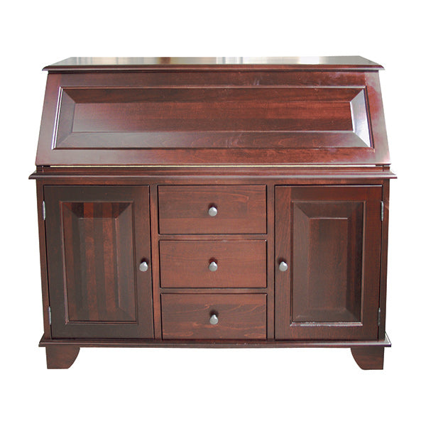 The custom-made Graham Secretary Desk is a beautiful desk that will add value and style to any office, den, or formal living space. This traditional secretary desk has a large, closed desk top, two cabinets with lovely, beveled doors, and a trio of drawers for storage of office supplies and more. This handsome desk, show in cherry wood, is available in a variety of finishes and wood options, including maple, cherry, oak, and hickory. This American-made secretary desk measures 49" wide by 40 1/2" deep by 43" high, and is part of an entire series of Graham solid wood furniture from Barn Furniture, including a cabinet, TV stands, a mini desk, and a buffet. Like all of our Amish-made furniture, this substantial secretary desk is water and stain resistant, is made in the USA, and is guaranteed to add beauty and functionality to your home.