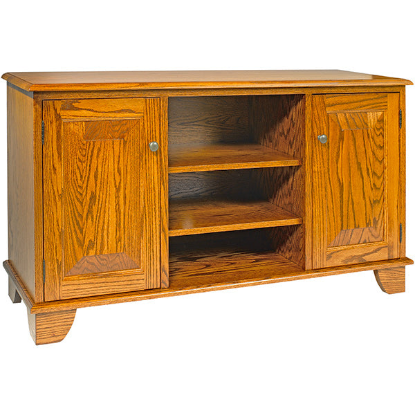 The Amish-made Graham TV Stand is a solid piece that will add functionality and storage to any formal living room, den, or family room. This substantial, handmade television stand features two cabinets on either side of the unit for concealed storage, while a trio of shelves in the center of the TV stand are ideal for storing remotes, movies, a cable box and more. This rustic, American-made stand measures an impressive 54" wide by 16" deep by 29" high, and features sturdy, finished feet that is ideal for a large television. The Graham TV Stand, shown in red oak, is available in a variety of woods and finishes that includes cherry, oak, maple, and hickory. This sizable TV Stand, like all of the solid wood furniture from Barn Furniture Mart is made in the USA, is stain and water resistant, and comes with a satisfaction guarantee.
