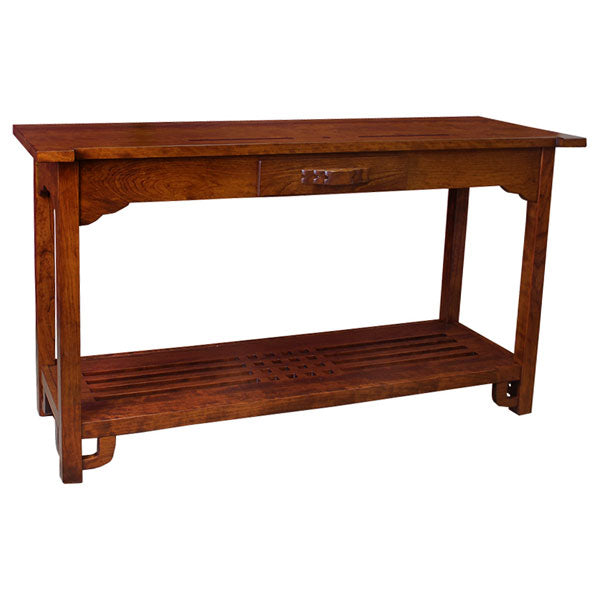 This Greene and Greene 54" Sofa Table boasts the finest design and an unparalleled level of craftsmanship in handmade furniture. The unique construction shown here features a cloud lift motif reminiscent of the innovative genius of the Greene Brothers. Their timeless style was innovated combining different aesthetics and motifs together into one elegant design. Hand made by skilled Amish craftsmen with decades of experience using Cherry (shown), you can take pride in owning furniture built to the highest standards with the strictest attention to detail.